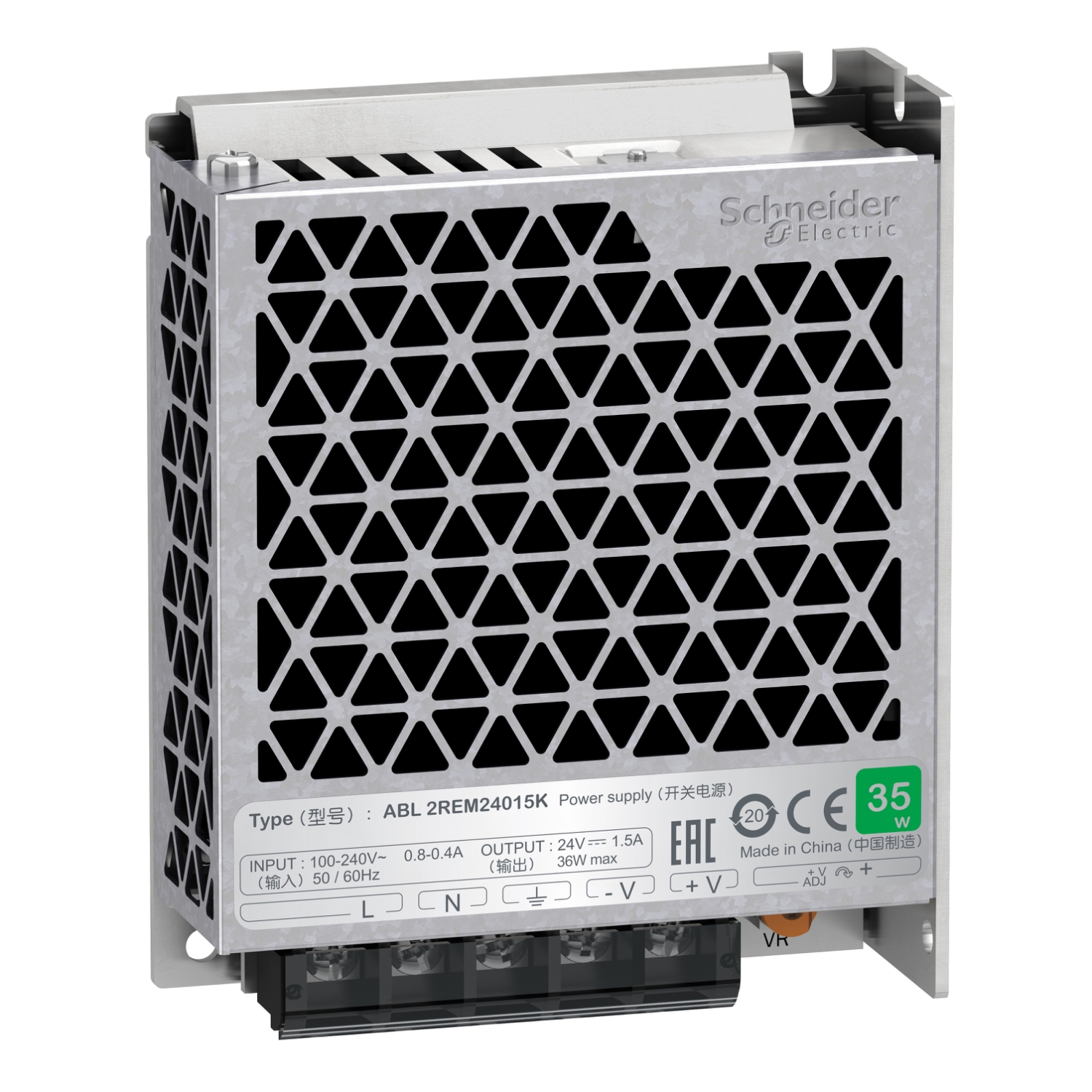 This power supply belongs to Easy Modicon power supply range (formely known as Phaseo Easy). It is a regulated switch mode 24V DC power supply, model 35W, with a 100V to 240V AC output voltage, and 36W nominal power. Its output current is 1.5A. It offers better performance with cost effective. Its cooling is based on natural convection. It has an automatic voltage switching. Its overload hiccup protection is 110-160%. It measures 99mm wide x 82mm high x 30mm deep. This power supply is fitted for repetitive machines. ABL2 ps are certified with: CE, EAC, KC, RCM, EN62368-1(safety), EN 61000-6-2, EN 61000-4-2/3/4/5/6/8/11 (EMC), 55032 class B, RoHS. This power supply has fixing holes for panel mounting or the 4-corner bracket mounting. Better performance with cost effective. Smart design.